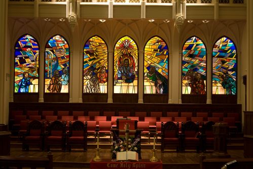 “The Good Shepherd” window facing Polk Street was installed in 1952 after a windstorm collapsed the previous glass windows. The 2,864-piece window stands 28 feet tall and depicts Jesus as the Good Shepherd taken from John 10 when Jesus said, "I am the good shepherd. The good shepherd lays down his life for his sheep . . . I know my sheep and my sheep know me, just as the Father knows me and I know my Father." This prominent window is lit from the interior of the sanctuary during the evening hours, shining the presence of the Good Shepherd across downtown Amarillo each night.